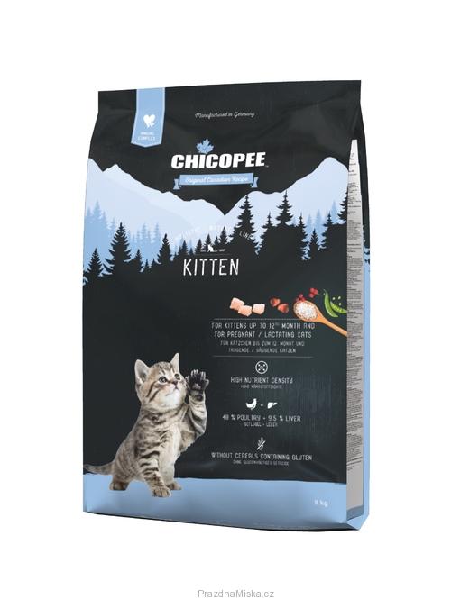 Chicopee Kitten je vyvážené kompletní krmivo pro koťata až do 12. měsíce života, které zajišťuje optimální vývoj pro zdravé, rostoucí koťata s koncentrovanou hustotou živin. Krmivo pomáhá podporovat přirozenou imunitní obranu, čímž přispívá k silnému imunitnímu systému. Zvýšená koncentrace živin zajišťuje dostatečnou prenatální péči o vývoj plodu u březích koček, produkci mléka u kojících koček.Přidání 9,5% jater (čerstvých a sušených) zajišťuje mimořádný chuťový zážitek.